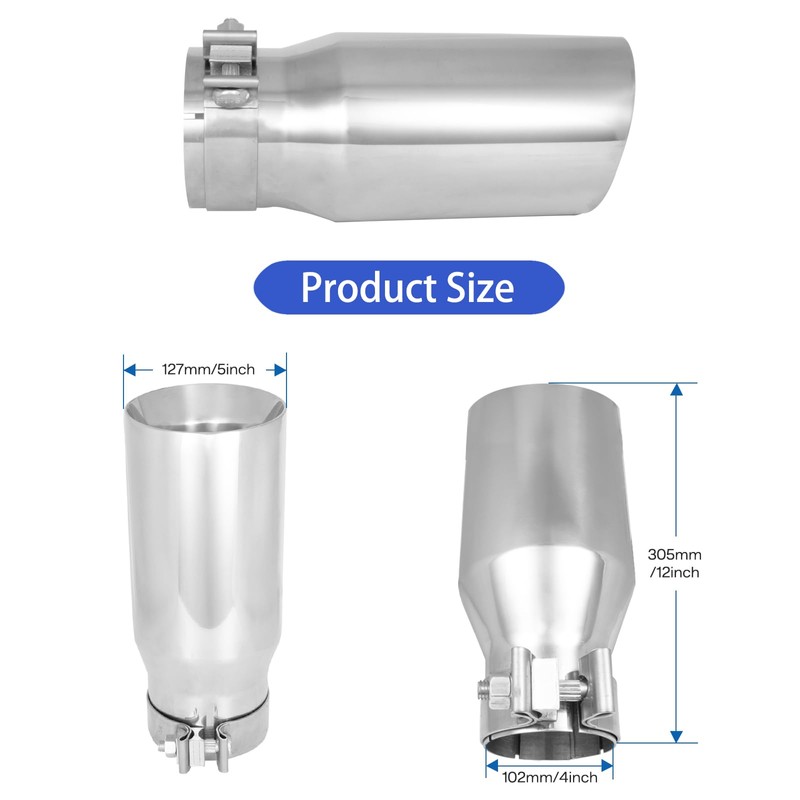 - PACKAGE INCLUDES:4" inlet 5" outlet 12" overall length stainless steel exhaust tips with clamp.