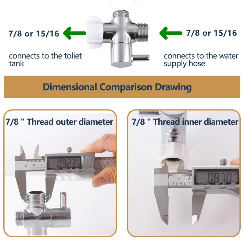 - Connection Size:The thread of the bidet shut off valve is 7/8"X7/8"X1/2". the 7/8" male thread is used to connect the water supply hose, the 7/8 " female thread is used to connect to the toilet tank, and the 1/2" thread is used to connect the handheld Spray hose, or connection 1/2" X 3/8" adapter for 3/8” bidet toilet seat attachment connection.