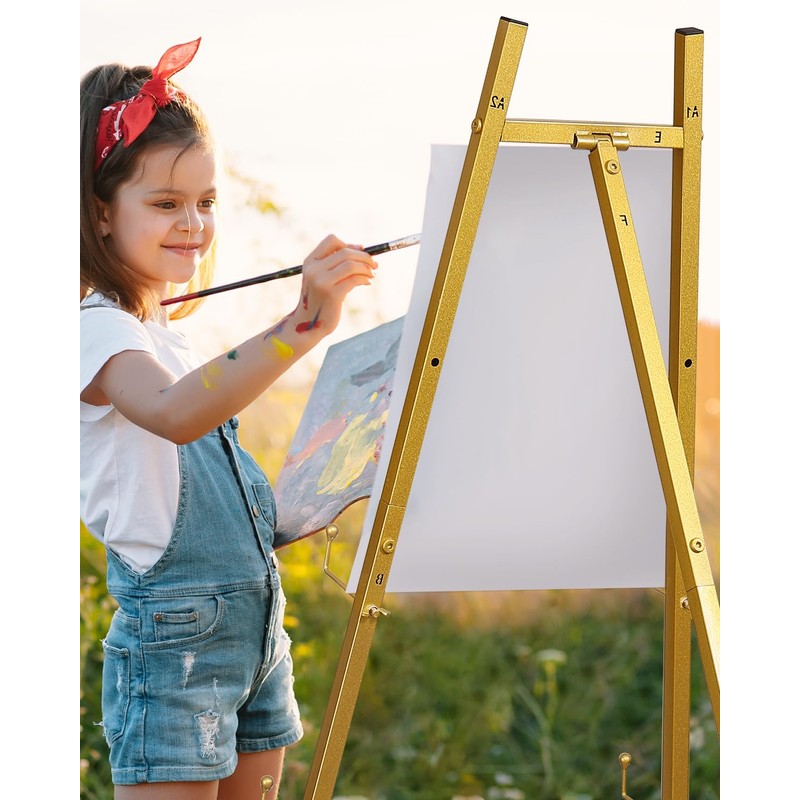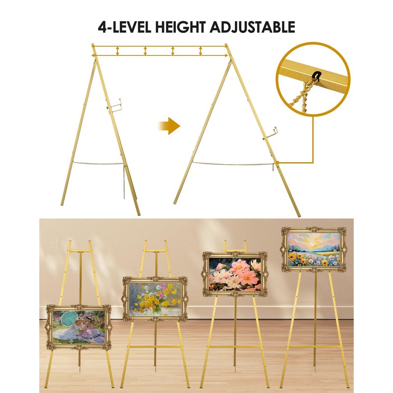 - Adjustable Easel Stand with 4 Height Levels:Our gold easel stand features a tripod design with 4-level adjustable height holes. Simply rotate the knobs to raise or lower your painting, poster, or signage—ideal for various event and display needs.