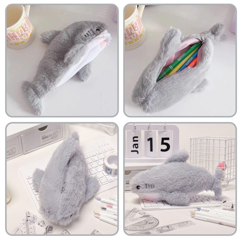 YSDYY 1 Piece Gray Shark Pencil Case, Cute Shark Zip Pencil Case, Plush Animal Stationery Bag, Large Capacity Storage Bag, Multi-Purpose Storage Bag
