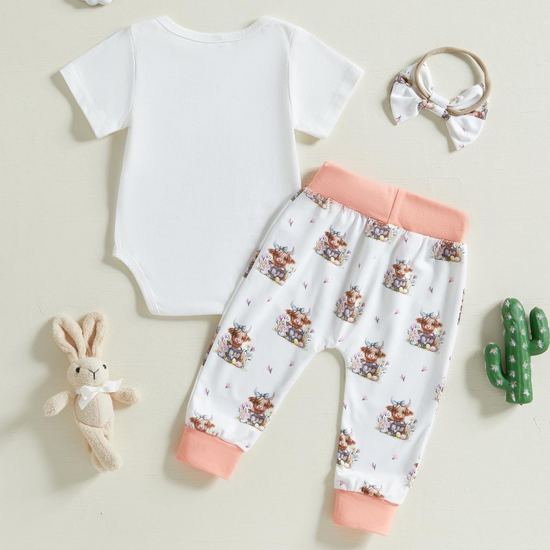 Baby Girl Summer Outfits Letter Cow Print Short Sleeve Romper Long Pants Headband 3Pcs Clothes Set