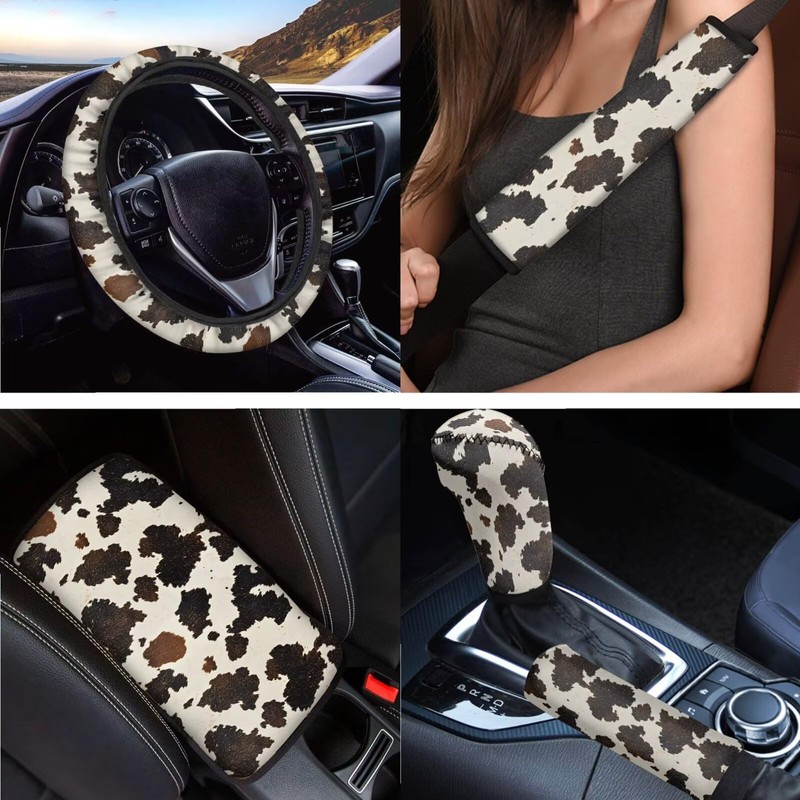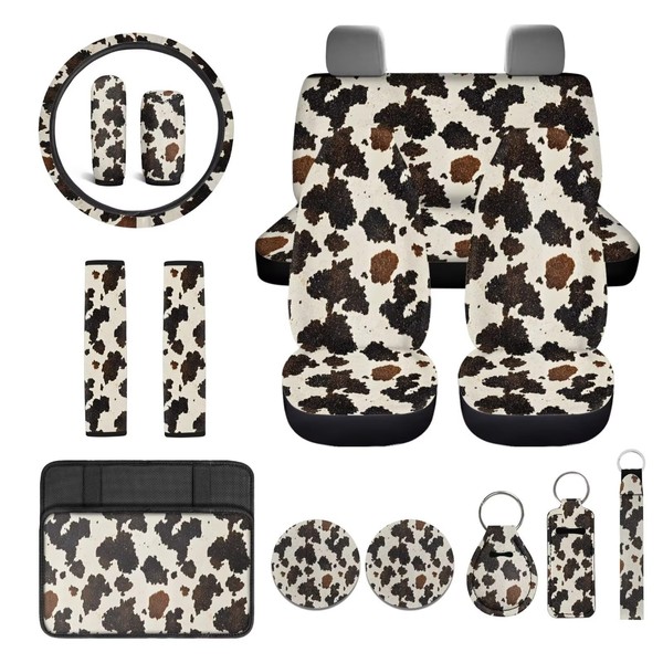 Yspwyqan 15 Pcs Cow Print Car Seat Cover Full Set Brown Automotive Accessories with Steering Wheel Cover,Armrest Cushion,Seat Belt Pad,Keychain,Lipstick Protector,Handbrake Cover 2025