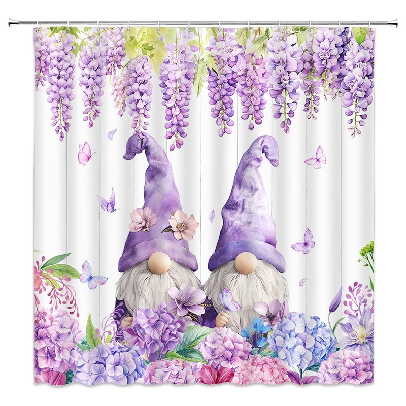YSSFAV Purple Floral Gnomes Shower Curtain Spring Flower Butterfly Rustic Farmhouse Wooden Board Romantic Bathroom Decor Curtains Set with Hooks, 70" W x 70" H