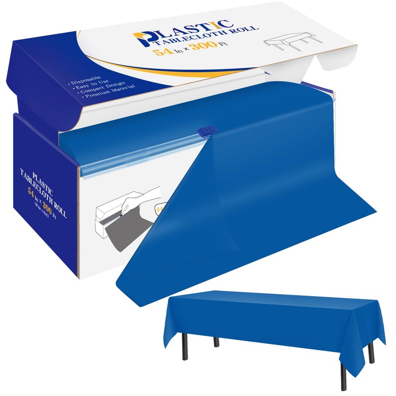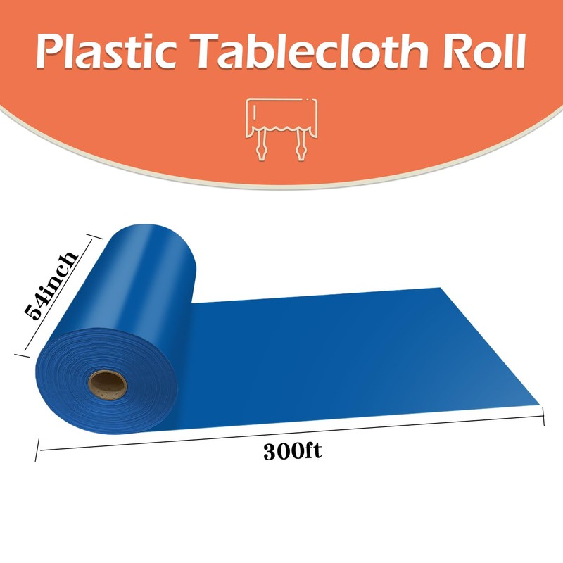 YSYJ Blue Plastic Tablecloth Roll Disposable 54 in x 300 Ft Plastic Table Cover with Slide Cutter Plastic Tablecloth for Parties