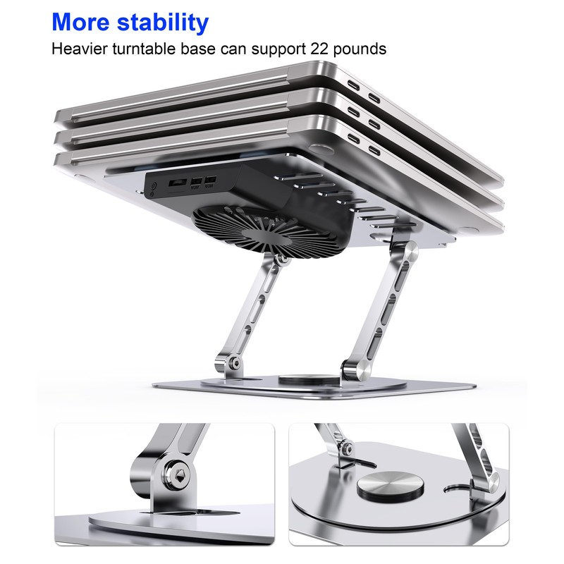 - More stability: The office computer stand is made of high-quality thickened aluminum, and the larger and heavier turntable base can support 22 pounds (10 kg), which is more stable and stronger without worrying about any shaking.Rubber non-slip strips on the stand add friction to protect your laptop from scratches and slippage