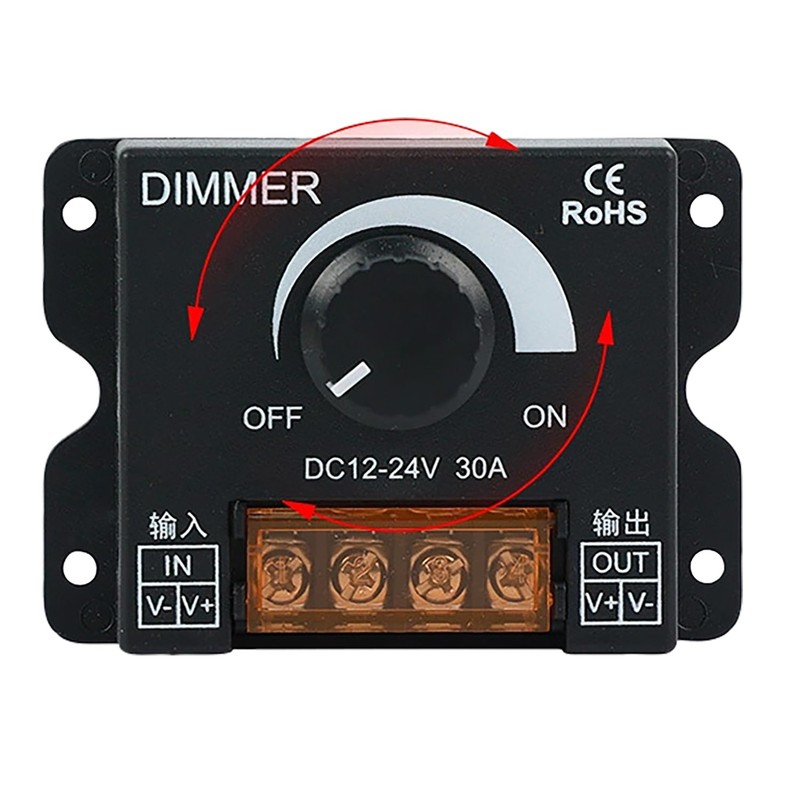 - FLEXIBLE USE - Suitable for DC 12V-24V MAX 30A LED lighting applications, single channel dimmer controller for single color 5050 3528 5630 LED strip lights. When connecting the LED lights and power supply, please pay attention to the correct position of positive and negative poles, otherwise it will affect the regulation function or the light strip will not be bright.