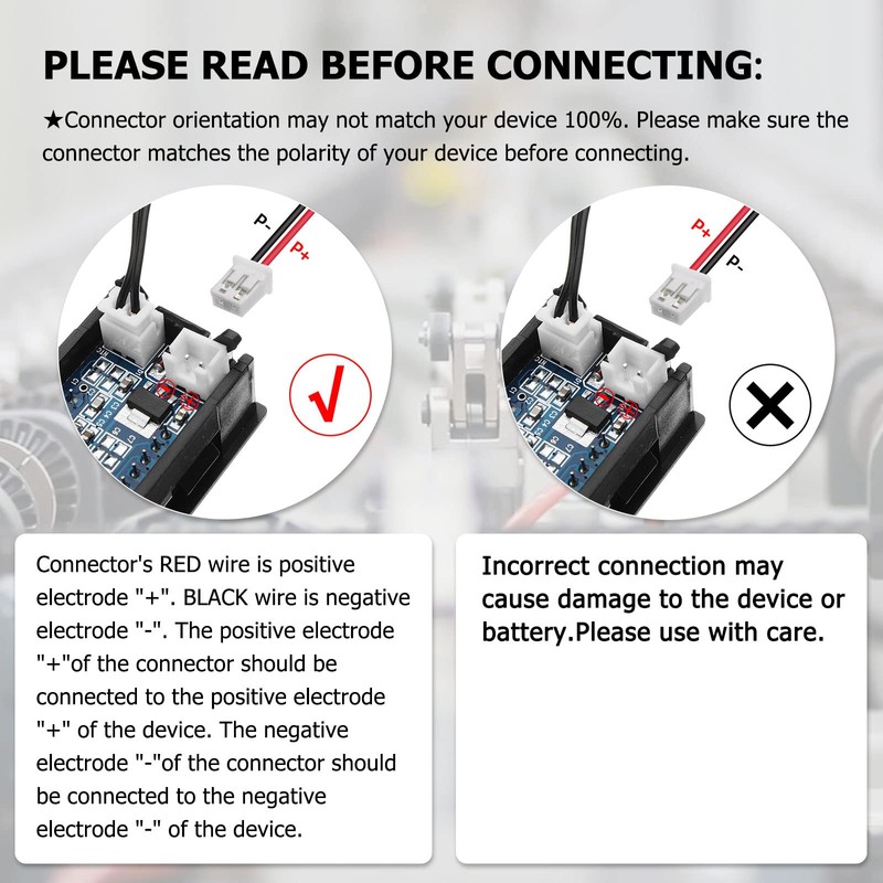 Red connect "+", Black connect "-"; el tamaño de la batería tiene tolerancia de -3mm-1mm, para no dañar la batería o acortar la vida de la batería, se prohíbe la carga de alto voltaje y la conexión incorrecta del polo positivo y negativo.