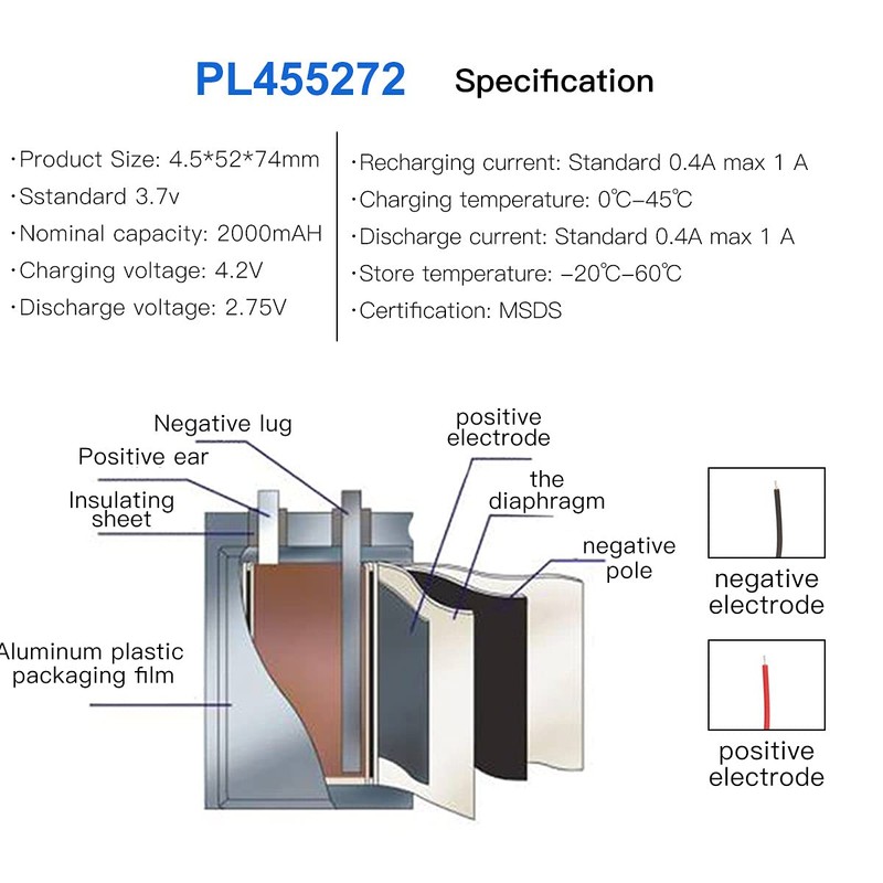 - Voltaje: 3,7 V; Capacidad: 2000 mAh; Voltaje de carga máximo/corriente: CC 4,25 V/1000 mAh