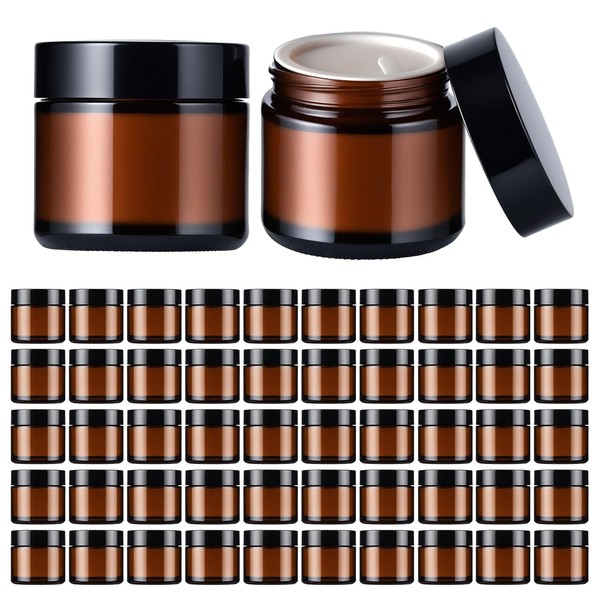 Ytuaebni 50ml Glass Jars With Lids, 50 Pcs Amber Containers With White Inner Liners & Glossy Black Caps for Cream Lotions Powders Ointments Sample & Candle Small Making (1.7oz Small Bottles)