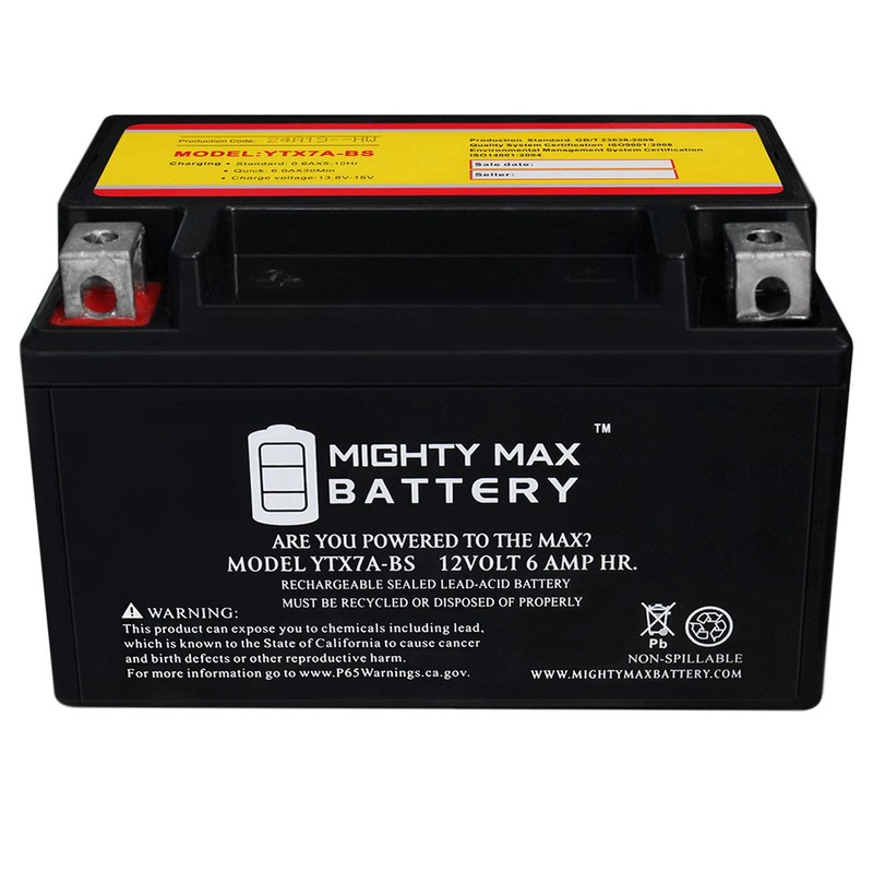 This YTX7A-BS is a sealed lead-acid (SLA) absorbed glass mat (AGM) rechargeable battery. AGM and GEL batteries are lead-acid and of the same battery chemistry. This battery comes already charged, sealed, maintenance free, and ready to install. Premium quality absorbed glass mat technology (AGM) is ideal for ATVs, Motorcycles, Personal Watercraft, Jet Ski's, Snowmobiles and more. **Specifications of the YTX7A-BS Battery** Voltage: 12 Volt Amperage: 6 AH Chemistry: SLA, AGM Terminal: Nut & Bolt **Battery Dimensions:** 5.90 in x 3.38 in x 3.70 in Weight: 5.51 Lbs **Warranty** 1 Year Genuine Mighty Max battery Product
