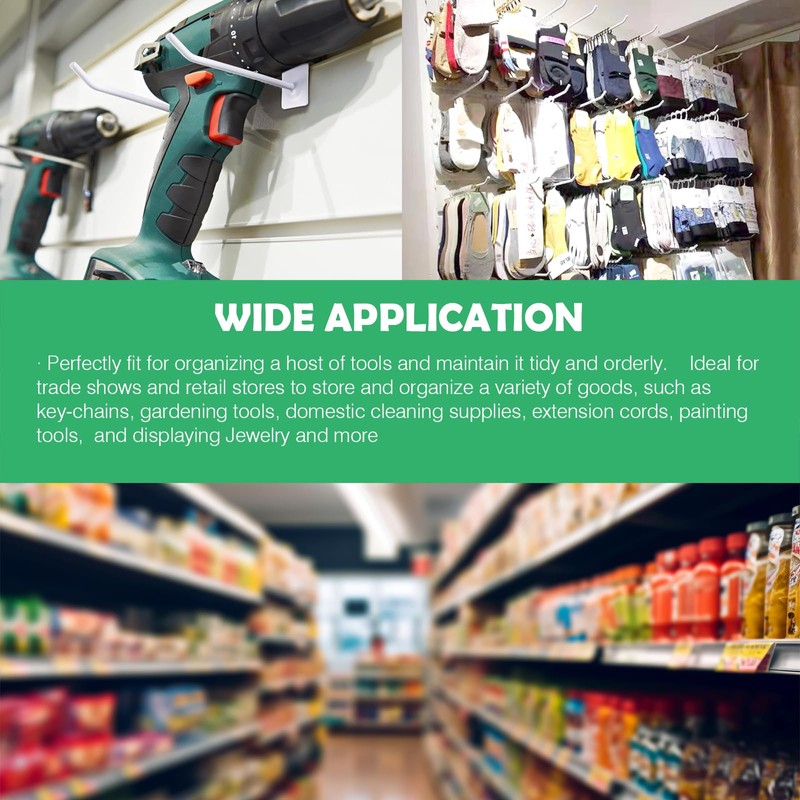 - [Wide Application] Perfectly fit for organizing a host of tools and maintain it tidy and orderly. Ideal for trade shows and retail stores to store and organize a variety of goods, such as key-chains, gardening tools, extension cords, painting tools, domestic cleaning supplies and displaying Jewelry and more. A must have hook for garages, hardware stores, home improvement stores, locksmiths, and retail stores.