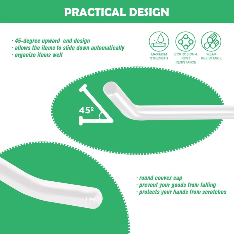 - [Aesthetic and Practical] Round convex cap prevent your goods from falling and protects your hands from scratches. The unique 45-degree upward end design allows the items to slide down automatically and and organize items well; The slat wall hooks for shelves are suitable for holding various items, firmly hold all of your retail and household needs that you may have.