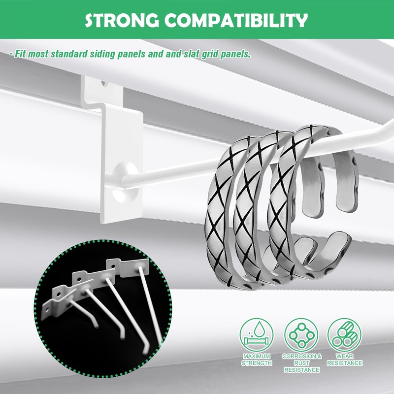- [Easy to Use] No tools required. Fit most standard siding panels and and slat grid panels. Place hook to both sides of the the panel slot, fix it into the slot on the panel then press down rod body and slide it to anywhere you like to fit, then lay them flat and hang what you need on above. Effectively creating room for your workspace or home.