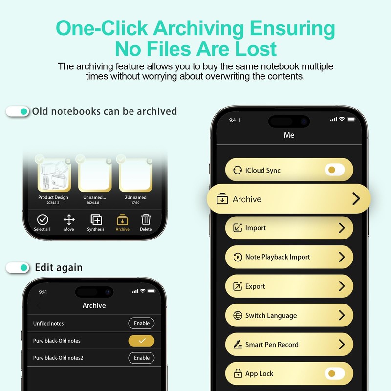 - Notebook Switching and Archiving: After the first use of each notebook, its folder will appear in the app. If you're using a different style of notebook, you can switch between them in the app to view their content. If you have multiple notebooks of the same style, you can archive older notebooks in the app to prevent their contents from being overwritten. Archived notebooks can be reactivated in the app at any time, so you don't need to worry about running out of notebooks or losing important content.
