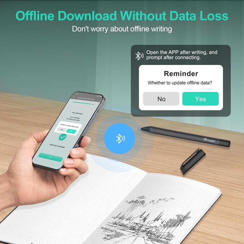 - Offline Storage: This feature allows you to continue writing and saving content even when you're not connected to your phone. The smart pen has a built-in 8MB memory card, capable of storing the equivalent of approximately 2000 pages of A4-sized data. When you reconnect to the Yuan App, you can download the offline data to your phone. Whether you're working, creating, or studying, offline storage ensures that key information isn't missed, helping you review important details later.