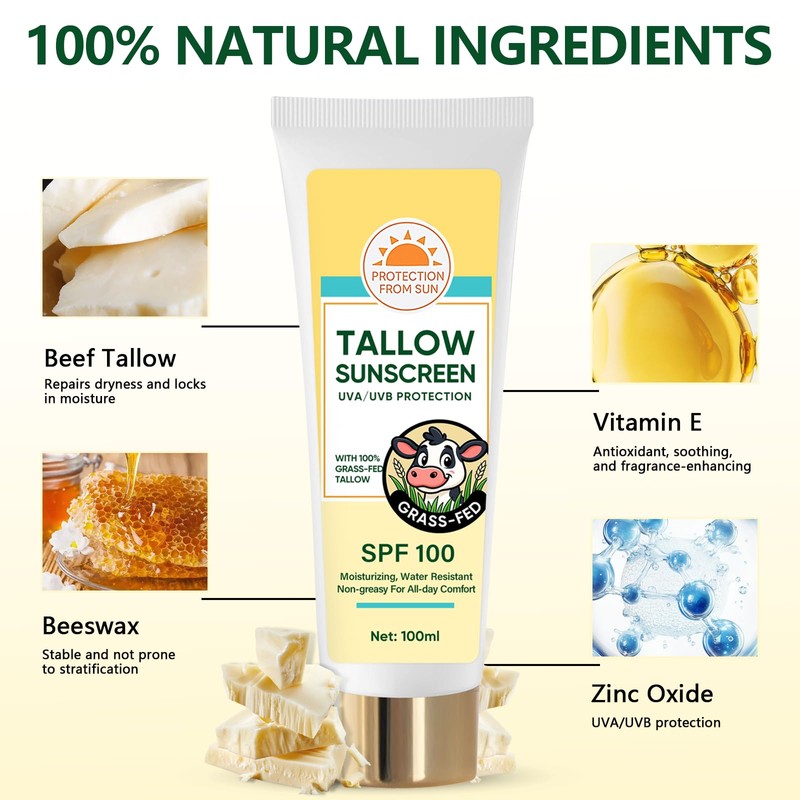 Introducing our Beef Tallow Sunscreen,all-natural way to protect and nourish your skin under the sun. Made with grass-fed beef tallow, this sunscreen provides a protective barrier against environmental stressors while delivering essential nutrients.It's the perfect choice for those seeking clean, sustainable skincare.Product Features:1.Natural Ingredients:Beef tallow skincare is rich in natural components. which can provide deep moisturizing and nourishment to the skin.2.Deep Hydration & Skin Repair:Our beef tallow sunscreen help restore moisture and strengthen the skin barrier.Perfect for dry or sun-damaged skin.3.Supports Sun Protection:While not a replacement for SPF, beef tallow provides a natural barrier against environmental damage.Perfect For:1.Natural skincare enthusiasts2.Those with sensitive, dry skin3.Outdoor loversPackage Lists:2.46 OZ*Beef Tallow Sunscreen