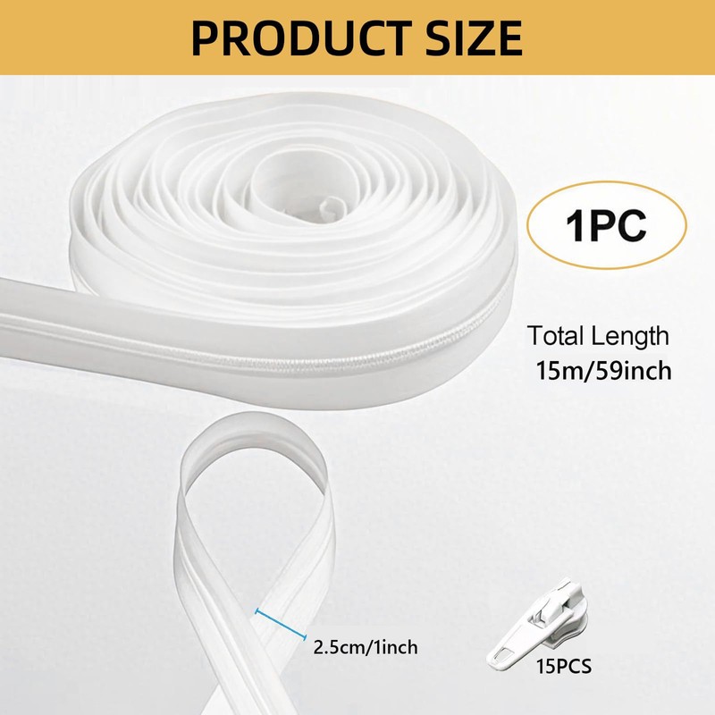Yuannee Continuous Zip with Zipper, 5 m Zips with 15 Zips, Separable Nylon, White, Zip for Bag, Clothing, Bed Linen