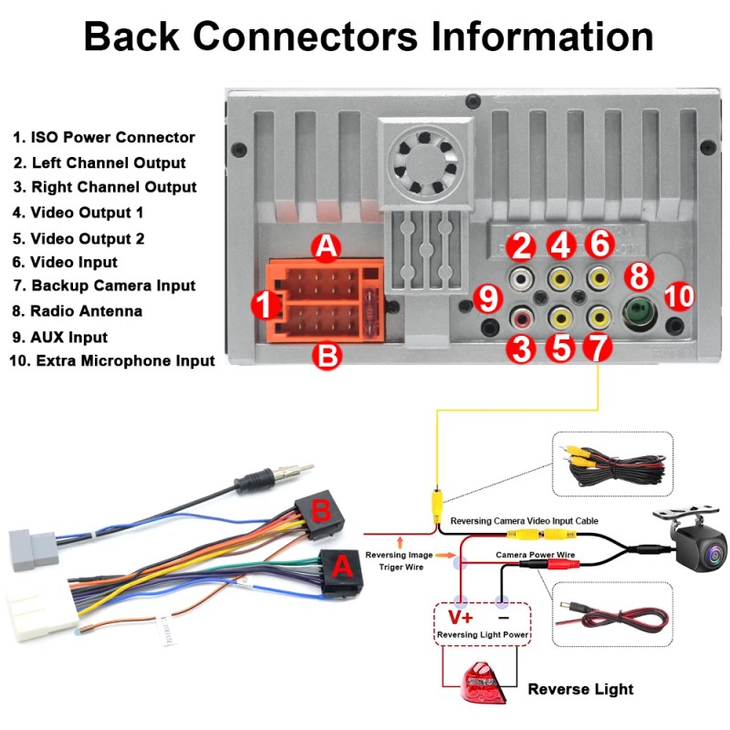 RCA terminal: 2 audio output, 1 reverse input, 1 video input, 2 video output