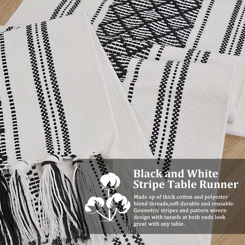 - Farmhouse Table Runner Boho Style: yuboo woven table runner delicate designed by blue white stripes and tassels, with raised geometric texture and full of detail, formed a aesthetics bohemian farmhouse style. Modern rustic macrame table runner increase the elegant mood of the home environment and further enhance the artistic taste and style.