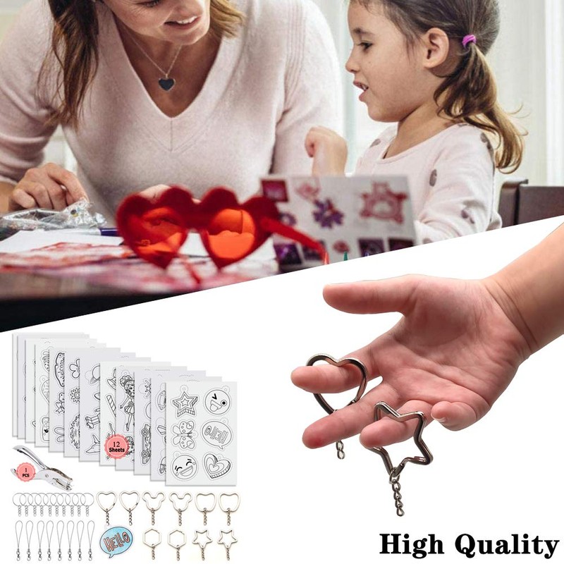 - WHAT YOU WILL GET --- This is a very complete heat shrink plastic keychain set, which contains: 100 x keychain, 1 x hole punch, 12 x shrink art paper. Draw on shrink paper with pencil or coloured pencil, create your art and shrink it. Use this kit to create a parent-child interaction with your child.