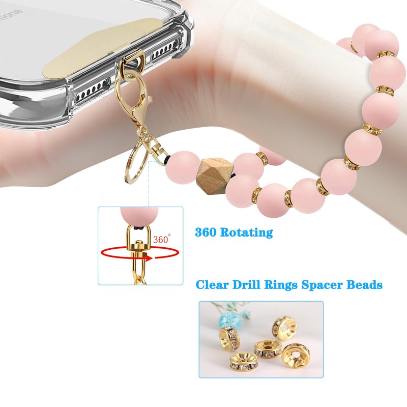 1. Our iphone wrist strap is crafted from silicone beaded strung together by two elastic ropes inside, the bottom connection can rotate 360 degrees with tether tab, a function phone chain for who needing quick phone access while keeping hands free. It looks luxury and elegance, perfect for women, girl,men.