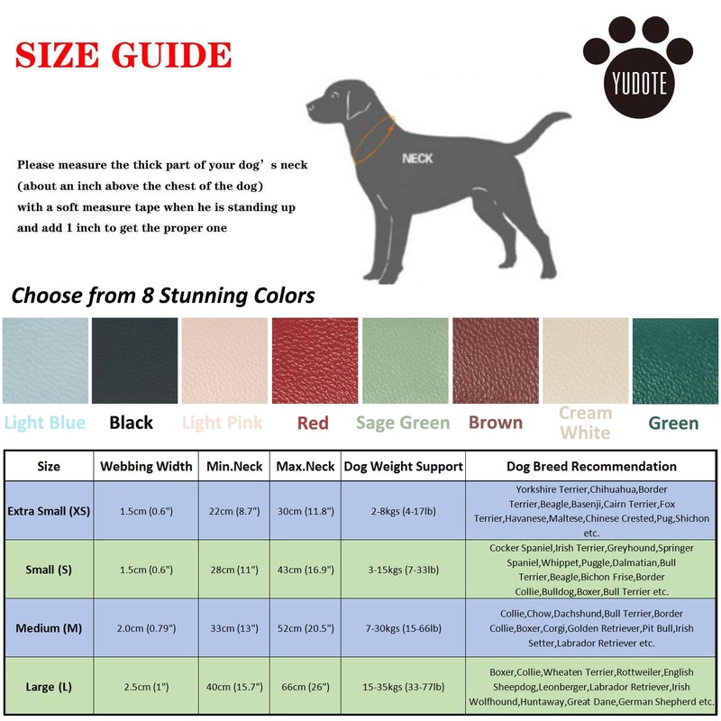 • Equipped with elegant gold plated quick-release clasp, our man-made leather collar is much easier to put on or take off, also much safer than buckle-style leather collar,which is not easily removed if your dog gets stuck on bushes,trees etc..