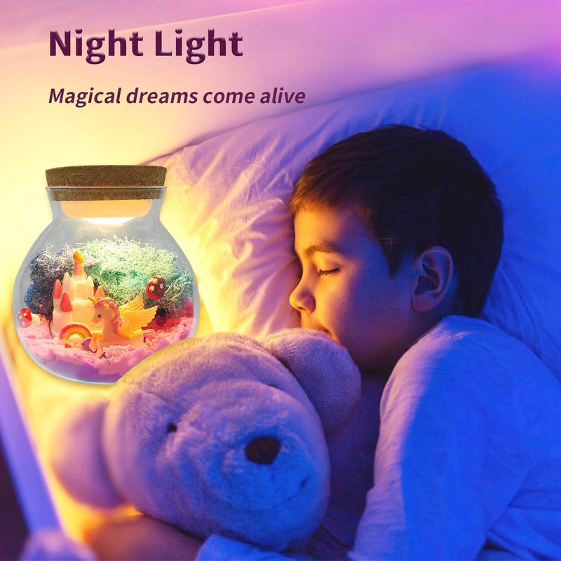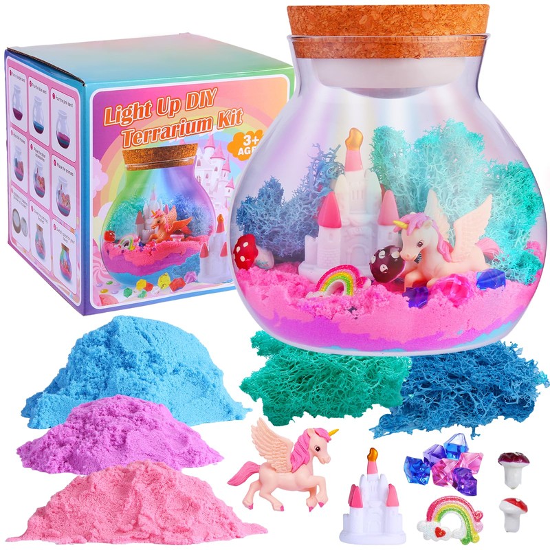 - 【Extensive DIY Terrarium Craft Kit】This terrarium kit includes terrarium, colourful crystals, magic sand, adorable animal, castle, rainbow, mushrooms and cool LED light.The accessories-rich set includes everything kids need to create a unicorn garden.Unleash the imagination as your kids create their own magical world inside the terrarium.