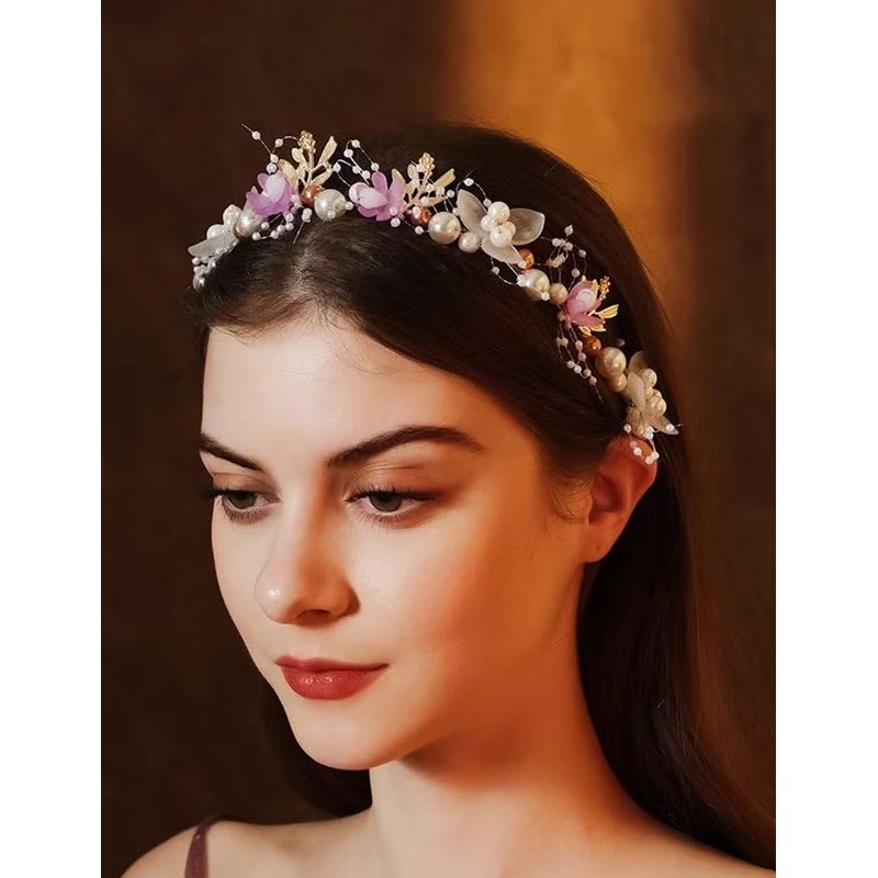 YUEKISEN Bridal Pearl Wedding Headband Gold Leaf White Flower Headpiece Princess Fairy Flower Headband Floral Hair Accessories for Women Photography Party Prom (Purple)