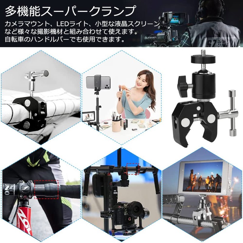 - Multi-functional Super Clamp: Can be used in combination with various photographic equipment, such as camera mounts, LED lights, and small LCD screens. A must have tool for photography. It can also be fixed to a variety of crossbars, brackets, tables, railings, etc
