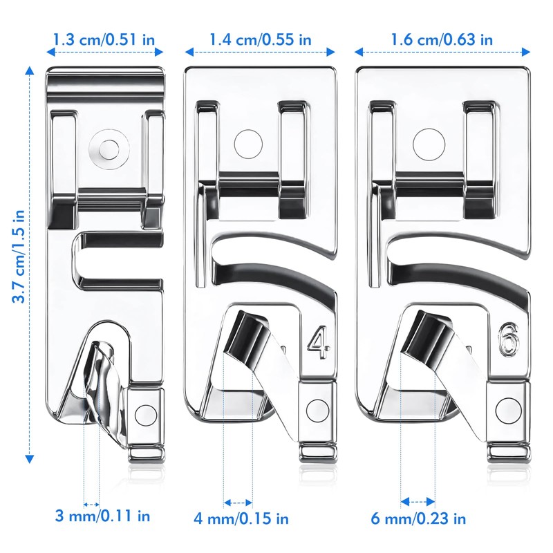 - 3 different sizes:The set includes 3 sizes of rolled hem foot, which can be crimped and sewn at the same time, it is suitable for some thin fabrics so that it can be rolled up better for some nice patterns.