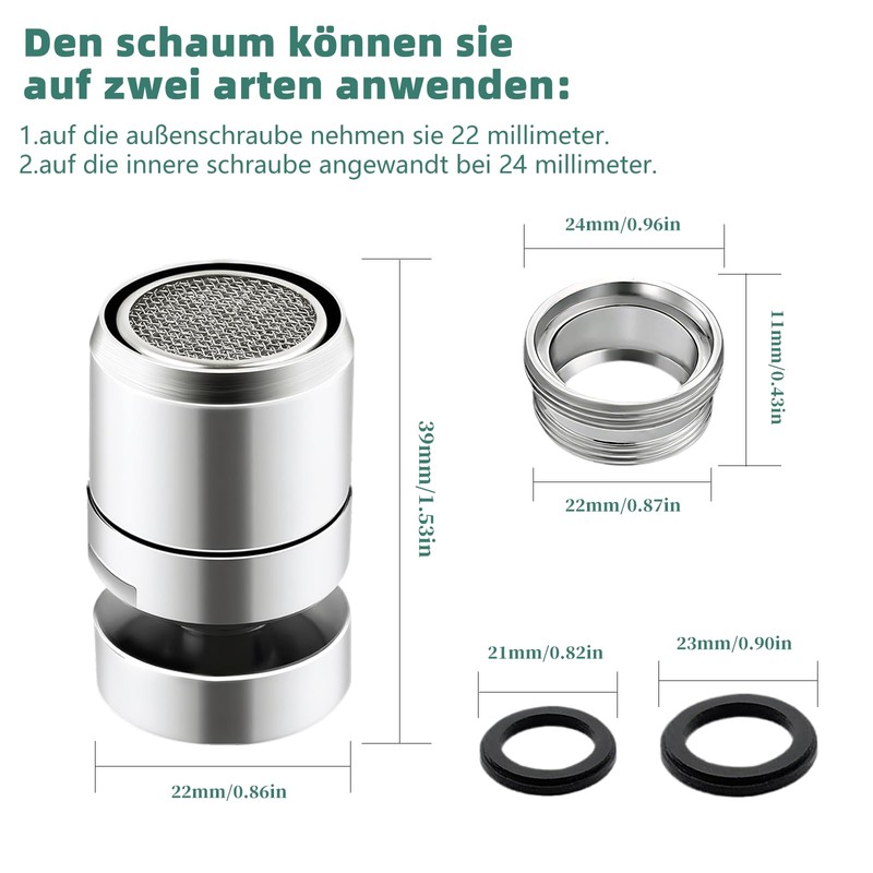 - Lieferumfang – Sie erhalten 2 × 360° drehbar Wasserhahn-Perlatoren, 2 × Adapter (M22 Innengewinde auf M24 Außengewinde) sowie 6 × Gummidichtungen. *Hinweis:* Unsere Perlatoren sind nur für Wasserhähne mit 22 mm Außengewinde oder 24 mm Innengewinde geeignet.