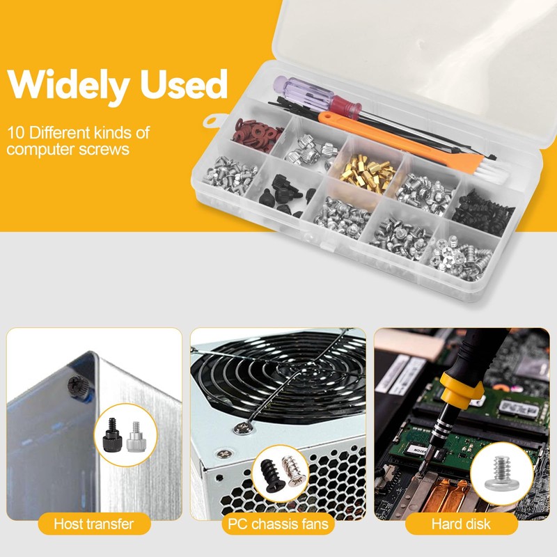 • Convenient Storage: These computer screws are neatly packed in separate compartments within a transparent storage box. The transparent design allows you to quickly locate the required screw size without searching, saving you time. The separate compartments also prevent screws from colliding or wearing out, keeping them in pristine condition and enhancing your work efficiency
