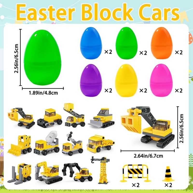 - Package Includes You will get 12 packs Construction Vehicles Car building blocks and 12 pcs easter eggs(6 colors), Sufficient quantity and various styles to meet your exchange needs. It is an excellent choice for Easter kids school and home education.Warm reminder: 12-in-1 block assembly requires the back of 12 small blocks from 1-12 to be combined together to form a large block.