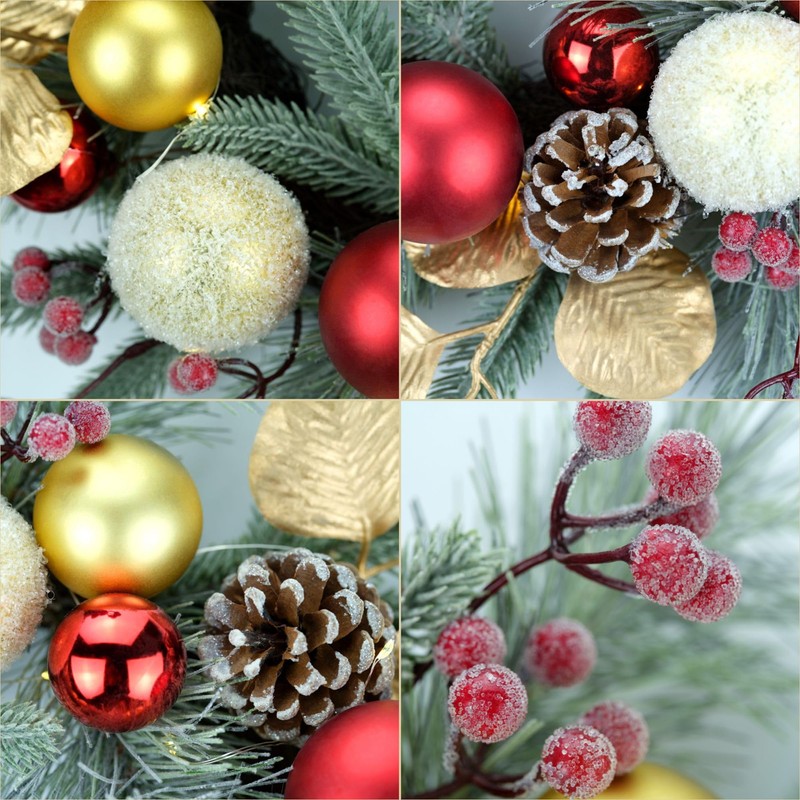 The base frame of the wreath is made of natural rattan, adding a touch of rustic charm. Adorned with red baubles, frosty red berries, natural pine cones, golden leaves, frosted spruce branches and pine needles, and more, this wreath captures the essence of traditional Christmas spirit.