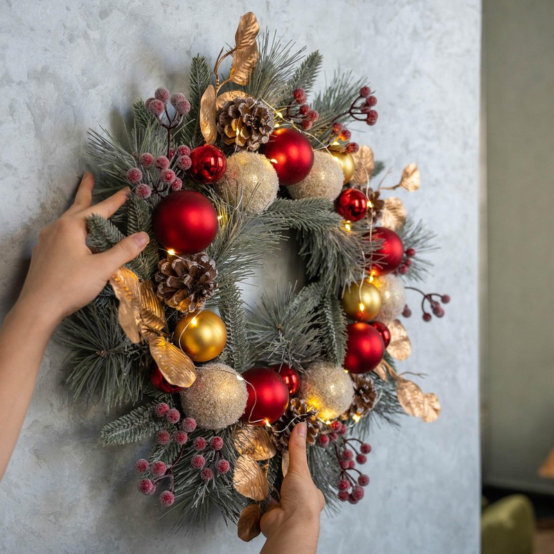 - Classic Christmas Elements. This Christmas wreath measures 20 inches in diameter, making it the perfect size for hanging on your front door, window, or porch, instantly elevating the festive atmosphere. Adorned with baubles, natural pine cones, berries, spruce branches, pine needles, and more, this wreath captures the essence of traditional Christmas decorations.