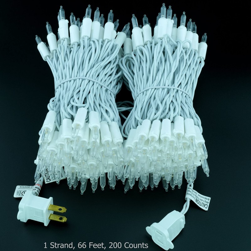 - Extra Long More Lights ♥ 200 warm white LED bulbs on white wire, 1 strand total length 66 feet. 4-inch spacing, 4-inch lead, 4-inch tail. With a tangle-free design and robust commercial grade 22 AWG wire with a pure copper core, installation is swift and professional. Waterproof design allows it to be used indoors and outdoors. The versatility of our malleable string lights is limitless: adorn Christmas trees, railings, stairs, fences, bushes, or shape them creatively to match your décor.