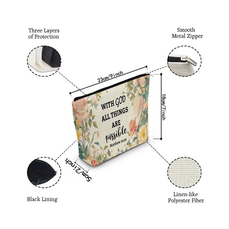 - 3.The Floral Bible Quote Makeup Bag has a delicate design and a vivid double-sided print. The words "WITH GOD ALL THINGS ARE POSSIBLE. Matthew 19:26" are printed on the bag, which makes it unique and meaningful. You can choose different patterns in our store. They can not only fit public aesthetic but also meet personalized demand.