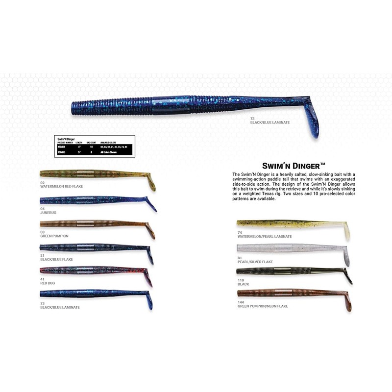 - Design of the Swim’N Dinger allows this bait to swim during the retrieve and while it’s slowly sinking on a weighted Texas rig