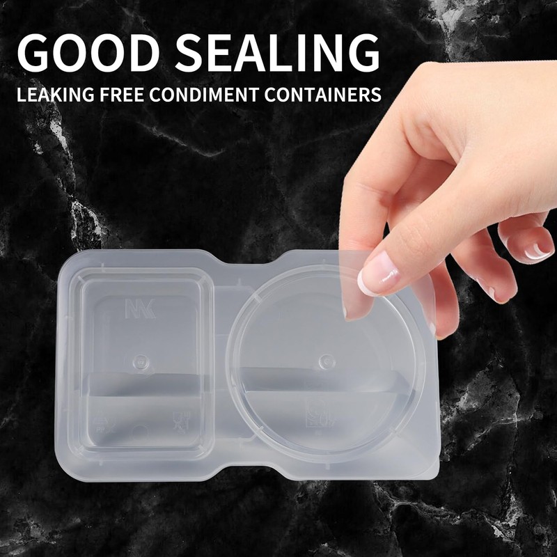 - STORAGE AND ORGANIZATION: The double condiment containers with lids has an inwardly buckled design with good sealing, leak-proof and lightweight features,convenient to carry,it can be used for takeout orders,delivery services,restaurants and more.enjoy your favorite snacks anywhere.