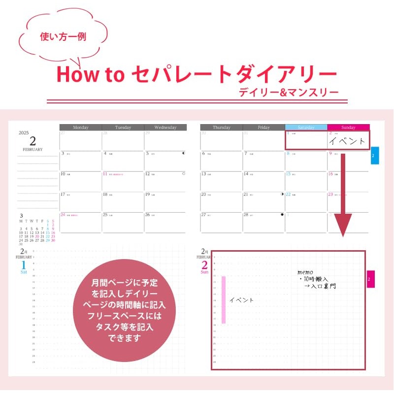 ● View your monthly and daily schedules at once through the book’s divided upper/lower page design. Manage your long-term and daily schedules at the same time.