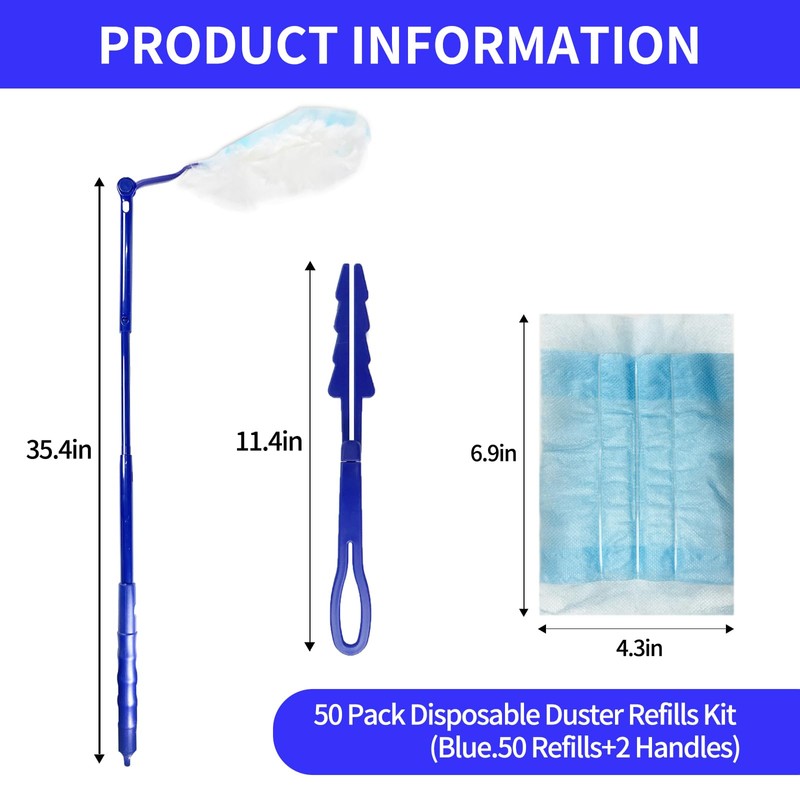 Yumrum 50 Pack Disposable Duster Refills Kit with Blue,50 Refills and 2 Handles - 180 Degree Extendable Handle Dusters for Cleaning Home Ceiling Office Blinds