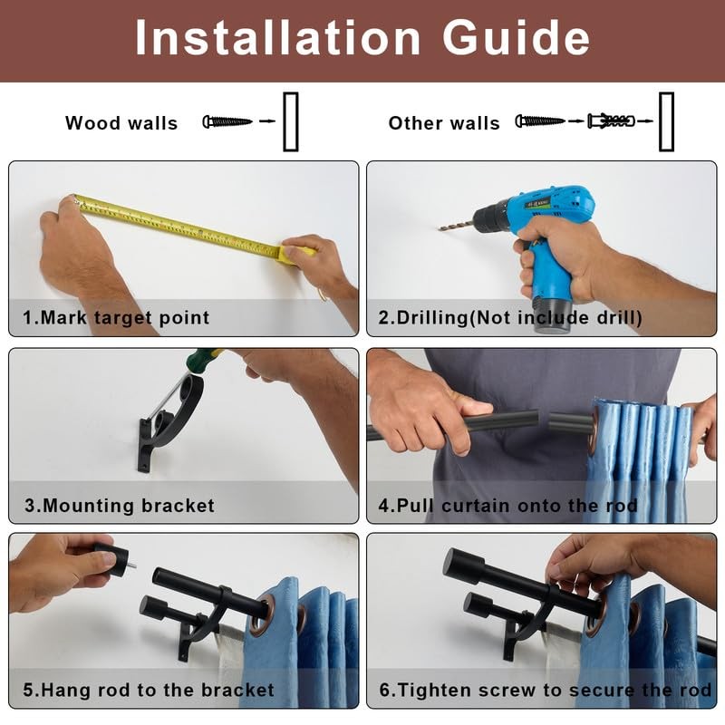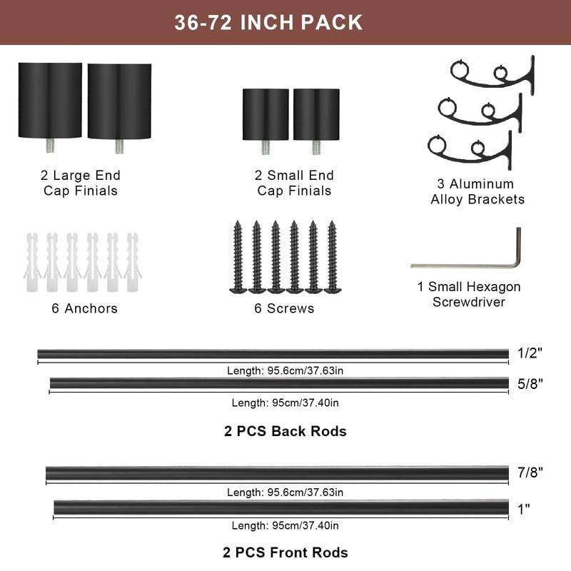 - EASY TO INSTALL: The double window rod 36-72" packed with 1 set of front rod (2pcs rods), 1 set of back rod (2pcs rods), 2 large finials, 2 small finials, 3 double brackets, 1 set of screws & anchors and instructions. You can mount these curtain rods easily on the wall.