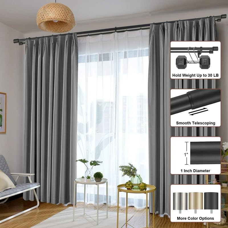 - DECORATIVE AND PRACTICAL: Available in 3 colors (Matte Black, Brushed Nickel, Light Gold) and 2 dimensions (36-72", 72-144"). Put the sheers on the back rod and the blackout curtains on the front rod. The simple and modern look can be matched with various home decorations.
