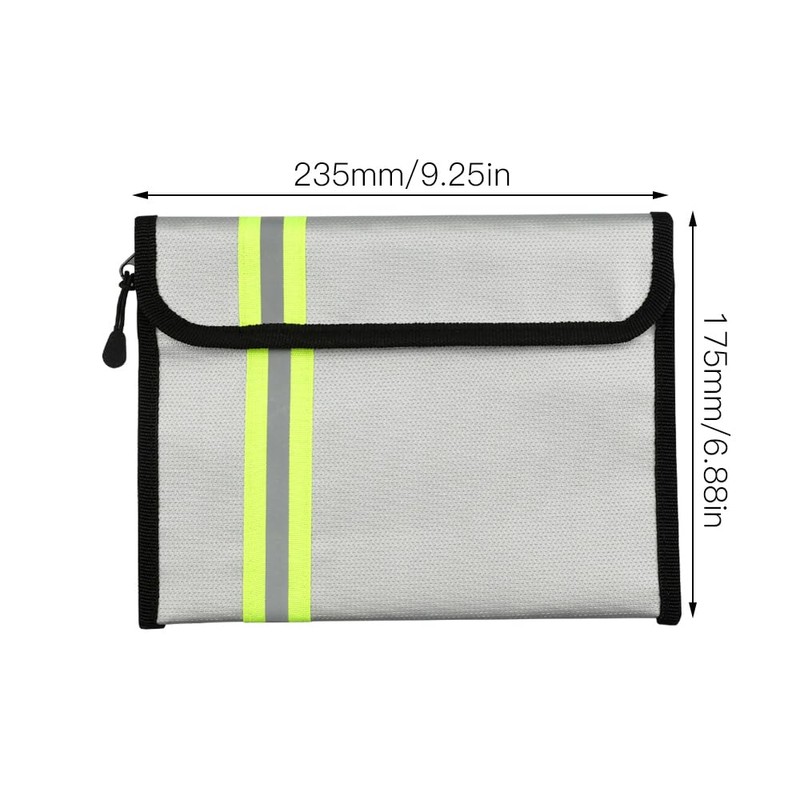 - Document Bag This is a fireproof and waterproof document bag, the color is gray with green reflective stripes, and the size is 23.5 x 17.5 cm.