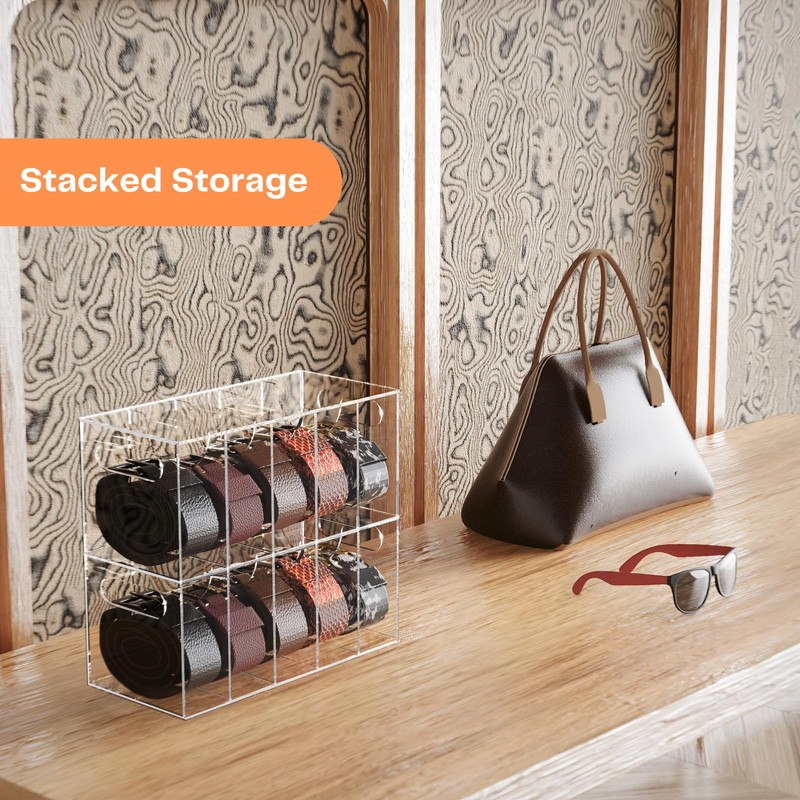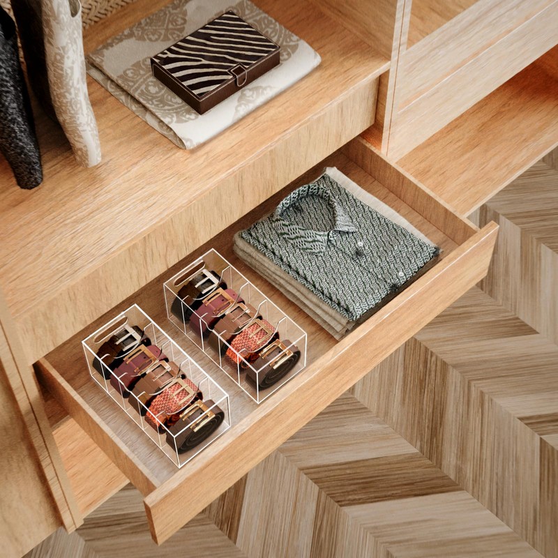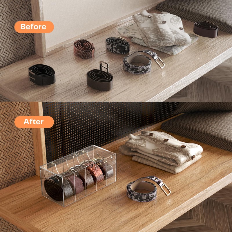 - EASY ORGANIZATION: This is a 5-compartment belt organizer with a clear design that ensures quick access and avoids rummaging through your closet. It is ideal for organizing your closet.The stylish clear belt drawer organizer with a curved middle allows you to easily access the belts you need.