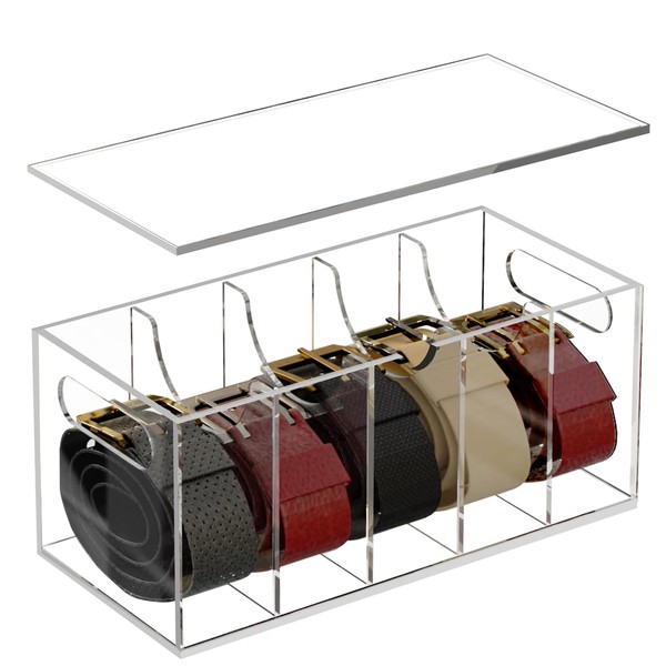 YUNEASELF Acrylic Belt Organizer Holder for Closet with Dust Cover Lid - Clear Storage Display Case for Drawer - 5 Compartments