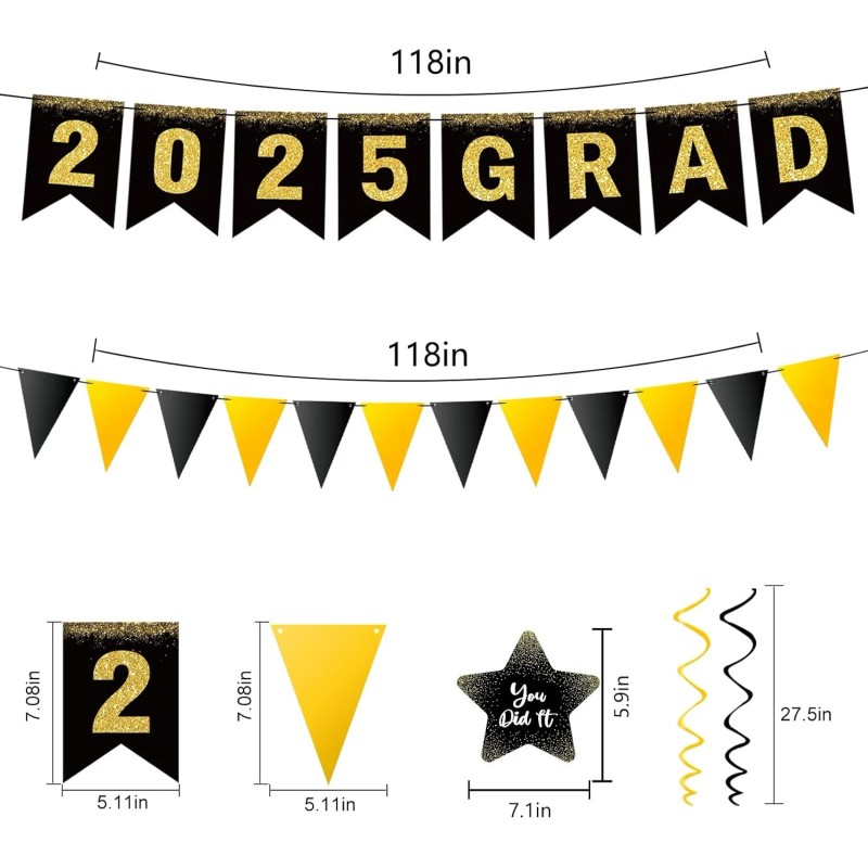 - WELL DESIGNED: Package includes 1pcs 2025 GRAD banner string, 12pcs hanging swirls, 6pcs paper pom poms, 8pcs themed cutouts (double-sided print) with 8pcs hanging swirls. String measures about 9.8ft, each banner 7.1x5.2in, distance adjustable. Perfect size for classroom, home or party decorations.