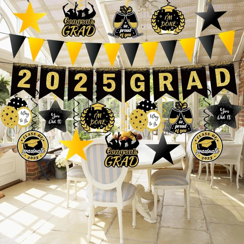 - GRADUATION DECORATIONS SET: Full of cute graduation patterns of grad cap, certificate, and Class of 2025, Congrats GRAD. Simple but stylish designs ideal for your son, daughter, niece, or nephew’s graduation party, or class party, let your young achiever feel how much you're proud of what he/she have attained.