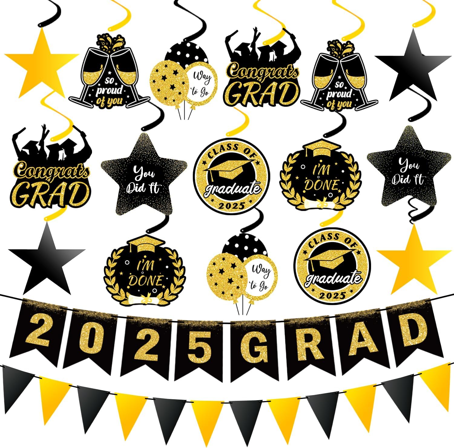 Yunfan 34Pcs Graduation Decorations 2025 Pre-Assembled Hanging Swirls 2025 Black