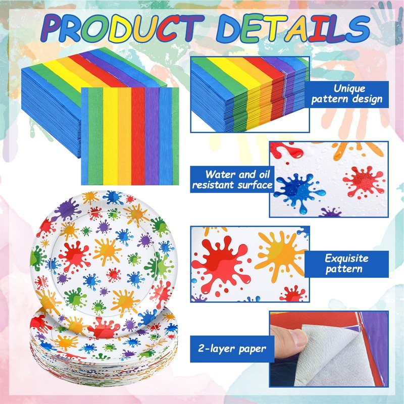 - A Creative Canvas: our painting party favors transform your table with a artistic painting style; The plates boast multi colored paint splatters while the napkins feature matching stripes; These vibrant and imaginative pieces make charming art party decorations